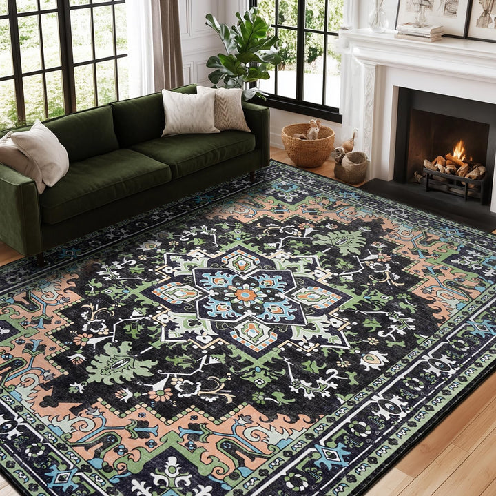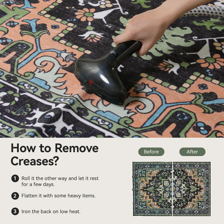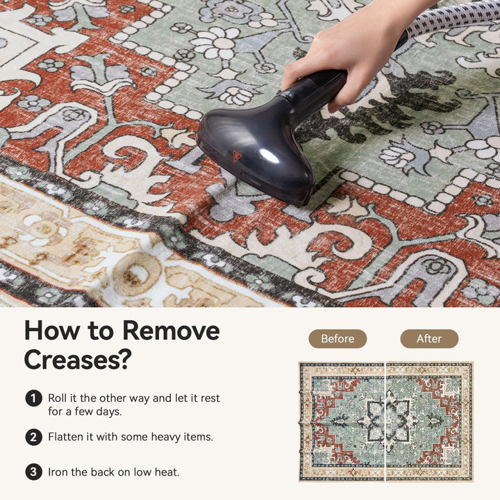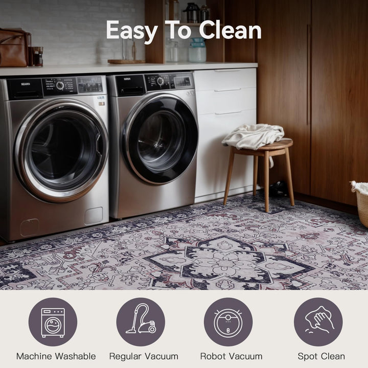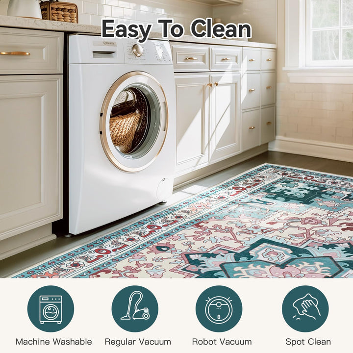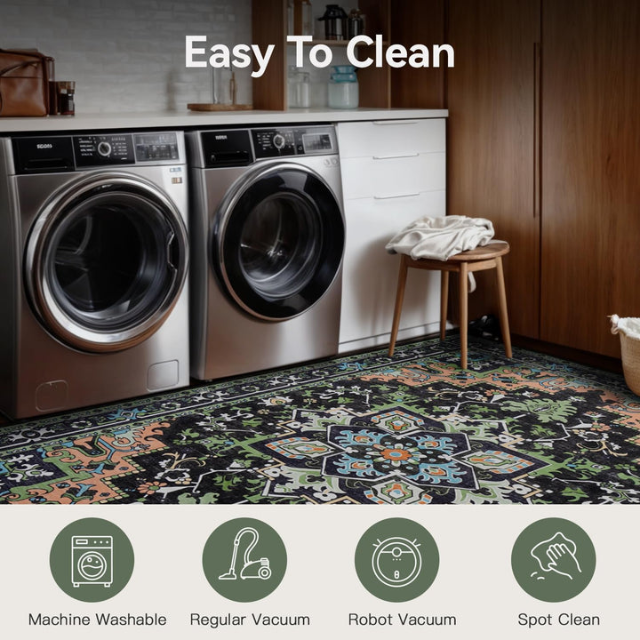 Easy Care: With stain-resistant feature, this washable large area rug makes cleanup simple—just wipe up spills right away. For regular upkeep, vacuum to remove dust and dirt. The rug is also machine washable—wash gently in cold water and air dry naturally. To preserve its vibrant colors, avoid using bleach. For rugs sized 6'x9' or larger, we recommend using a commercial washer.