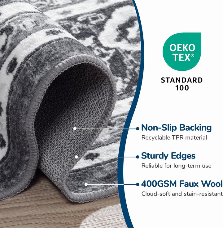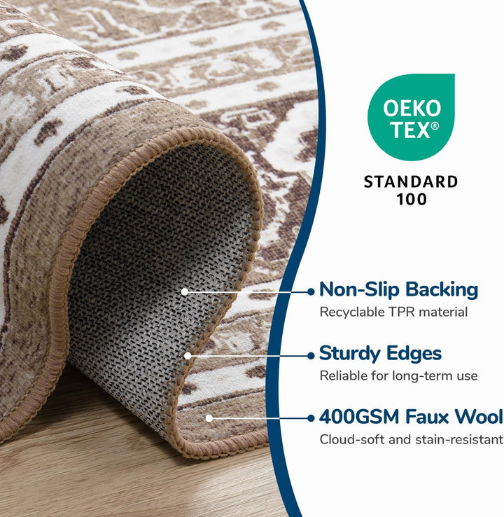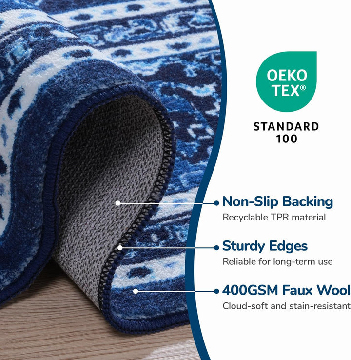 Ultra-Soft & Non-Slip: The surface of the boho area rug is made from super-soft faux wool, making it feel like walking on clouds—warm and comfortable underfoot. The backing features non-slip rubber (TPR) that securely grips the floor, ensuring the area rugs stay in place when walked or run on. This offers peace of mind, especially for households with elderly members, children, or pets